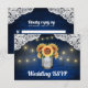 Sunflower Mason Jar Blue Wood Wedding RSVP Cards - feature a royal navy or blue barn background trimmed with lace and decorated with warm colored string twinkle lights. The design also features a bouquet of sunflowers inside a mason jar that you can customize the initials to those of your choice. The back also features the same country rustic background to match the front.