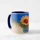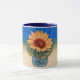 Single sunflower resting in a clear blue vase on a blue to gold background.