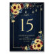 Create the perfect reception setting with this warm,trendy table number design featuring sunflower, navy blue and burgundy watercolor floral design, featuring a navy blue wood background, sweet string lights. Perfect for fall and winter weddings. Copyright Elegant Invites, all rights reserved.