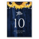 Rustic navy blue and sunflower wedding table number card featuring sunflower flowers and string lights against a rustic wood background. Matching items available.