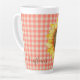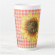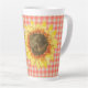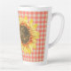 Charming country/farmhouse style coffee mug features gingham check background with large watercolor sunflower bloom