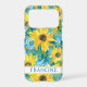 Customize this colorful modern sunflowers on teal painting iPhone 17 pro case with your your name in a trendy modern CAP font in teal on white. It's so beautiful and happy!