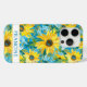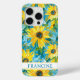 Customize this colorful modern sunflowers on teal painting iPhone 15 pro case with your your name in a trendy modern CAP font in teal on white. It's so beautiful and happy!