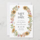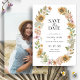Sunflower Photo Save the Date Card. This modern save the date features stunning hand-painted watercolor pink and dusty blue wildflowers, beautiful yellow sunflowers, and sage greenery arranged as a lovely wreath that's perfect for those who love whimsical boho / bohemian elegance. Find matching items in the Modern Sunflower Wedding Collection.