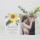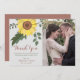 Rustic, elegant, adorable, giant sunflower and greenery wedding thank you card with photo of bride and groom.