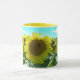 This ringer mug features a photo of Sunflowers in the center, sidepanels of bright yellow, a border of dark blue around the photo and sidepanels, and a kiss of light yellow around the rim and on the handle. This is the same photo that I used to create two other products in my gallery--"Sunflower Power--Card" and "Sunflower Power--Stamp". It was taken on a sunny August day in a large field of Sunflowers near Rochester, NY. Three other photos I took in that same field on that same day have been used to create several other products in my gallery.