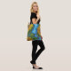 Tote your stuff in style with a pretty sunflower print cross body bag or shoulder tote featuring big yellow sunflowers and green leaves against a blue background. Original colored pencil artwork by The Gifted Grackle.
