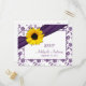 The text on this sunflower violet purple and white damask wedding RSVP or reply postcard is fully customizable. You can change it using the personalize option. For more extensive changes to the postcard, including changing the font, font color, font size, or text placement, choose the customize option. This RSVP postcard can easily be turned into a save the date postcard. Just change the text. Please note that postcards do not come with envelopes.