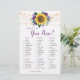 This bridal shower game card is What's in your purse? The design features watercolor sunflowers and purple rose flowers with foliage and string lights. Personalize the back of the cards with the bride's name. Matching products available.