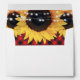 Red buffalo plaid floral envelopes with a return address featuring sunflower flowers and string lights on a red checkered background. Matching items available.