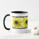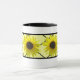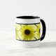 A cheerful mug with sunflowers heads on a black and yellow crisscross background. The ringer mug is accented in black, but can be "Customized" to another color.