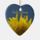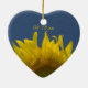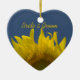 Commemorate your summer or fall marriage day with the natural Sunflower Rising Heart Shaped Wedding Ornament. This beautiful custom botanical Christmas ornament features a floral photograph of a yellow garden sunflower blossom on a blue sky summer day.