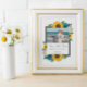 Design features elegant sunflowers, roses, and daisies with a golden yellow, teal and white color palette. Design also features a charcoal gray frame. You can change the background color on the front and back to the color of your choice or leave both set to white. Photo template via Pixabay licensed under CC0 and must be replaced with your own photo