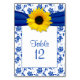Yellow sunflower with royal blue floral pattern and simulated ribbon wedding table number card. Change the table number and then add it to your cart. Repeat for each table number you need.