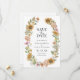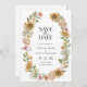 This modern save the date features stunning hand-painted watercolor pink and dusty blue wildflowers, beautiful yellow sunflowers, and sage greenery arranged as a lovely wreath that's perfect for those who love whimsical boho / bohemian elegance. Find matching items in the Modern Sunflower Wedding Collection.