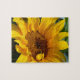 Colorful and bright, this SUNFLOWER SUN features a beautiful photograph of a rich yellow sunflower in full bloom, its petals tinged with orange near the base as a bee works busily at its golden centre with lush green foliage and hints of another sunflower in the background.