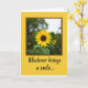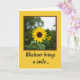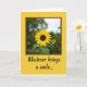 This greeting card centers on a large golden bloom with bright yellow petals circling a dark brown, seed-textured center, like a sun-facing flower in full view. Broad green leaves spread beneath it, their veins visible enough to feel close and familiar, like a quiet gift between friends ❤️. The flower photo sits inside a thin deep-brown frame, which is set on a wide sunny yellow mat with a narrow cream edge around the outside. Inside the framed image, the background fades into a soft blur of green foliage and faint shapes of other blooms, giving the main flower a tender, “all eyes on you” kind of attention. Near the bottom, a short line of text reads “Whatever brings a smile...” in black, flowing lettering, placed below the framed photo. The warm yellows and earthy browns balance with fresh greens, creating a gentle garden mood that feels like a shared moment on a calm afternoon 🌼. The outer border stays light and creamy, while the inner frame remains deep brown, neatly outlining the photo above the text.
