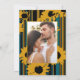 This modern photo wedding invitation combines clean design with warm, summer-inspired details. Your engagement or pre-wedding photo is paired with bold sunflower silhouettes, soft teal blue tones, and golden yellow stripes that bring a relaxed yet elegant feel to the design.