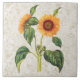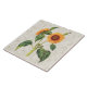 Ceramic tile with a vintage botanical illustration of a sunflower from The Gottorfer Codex, 1649-1659. Bright yellow flower with greenery on a light gold marble texture background. Choose from two sizes.