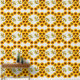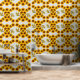The sunflowers are arranged in a repeating, interconnected pattern, creating a lattice-like effect. Each sunflower is surrounded by green leaves, adding to the natural and vibrant look of the design. The background is a clean, light color, which makes the yellow and orange tones of the sunflowers stand out prominently. This wallpaper would add a lively and warm touch to any room, perfect for bringing a bit of sunshine indoors.