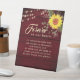 Elegant, country, boho, rustic burgundy wood wedding memorial pedestal sign with sunflower, gold gilded floral lace and string lights.
