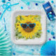 Cute yellow sunflower with heart sunglasses on rustic whitewashed wood.