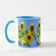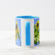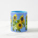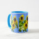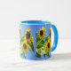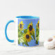 This coffee mug features photos of bright yellow sunflowers against a bright blue sky. Mug lip is ringed in blue and the handle is blue, as well. It may be raining outside but inside, with this mug, it is a sunny day!