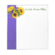 5.5” x 6” white notepad with an image of three bright yellow sunflowers and blue seas statice and a wide purple border. Optional text.