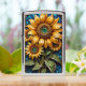 Colorful stained glass featuring sunflowers with vibrant leaves and a textured background in a decorative frame.