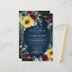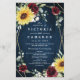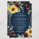 Design features a printed dark navy blue wood grain background with a geometric gold colored frame that's decorated with burgundy red roses, blush floral elements, sunflowers, greenery and eucalyptus.