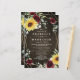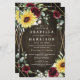 Design features a printed barn wood grain background with a geometric gold colored frame that's decorated with burgundy red roses, blush floral elements, sunflowers, eucalyptus and other greenery.