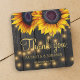 Editable text wedding thank you sticker featuring rustic big beautiful sunflowers on a dark brown barn wood background with string lights. Ideal for your summer or autumn fall elegant rustic country outdoor backyard or farmhouse wedding. +++++++ Personalize it with the bride's and groom's names and wedding details!