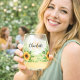 Decorated with sunflowers and eucalyptus greenery. Personalize and add your first name and monogram initials. Black and golden text.