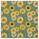 Sunflowers fabric with repeating pattern. Yellow flowers are interspersed with little dots of color, over a dark gray-green background color.