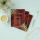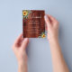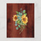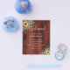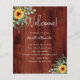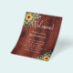 A modern, elegant, wedding program, timeline. Rustic brown wood as background. Decorated with sunflowers, green watercolored eucalyptus greenery. Personalize and add your names and wedding details. If you have more text it's possible to reduce the line space, and remove the decor on the back.