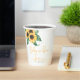Sunflower Baby in Bloom theme baby shower paper cups. "Baby in bloom" is in yellow modern handwritten style font. Personalize with your details.