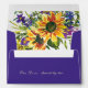 Dark blue, purple wedding envelope features vibrant rustic garden sunflowers, wildflowers and greenery in shades of yellow, red, purple and blue. The back features a pre-printed return address and inspirational quote, "One Love, shared by two…"