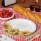 Vibrant yellow sunflower floral blooms bouquet border with greenery foliage making elegant boho chic spring summer fall garden bridal shower personalized paper plates with whimsical elegant modern hand lettered calligraphy script over a white background.