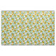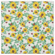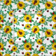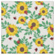 Summery floral fabric with a pattern of ladybugs sitting on and flying to big sunflowers with green leaves against a white background.