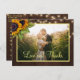 Sunflowers bouquet and strings of twinkle lights on brown barn wood photo thank you wedding postcard. +++++++++ Personalize with your names and text! ++++++++++ Suitable for floral summer or autumn fall / garden backyard rustic country themed weddings.