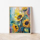 A vibrant modern abstract impressionist style painting of sunflowers. The artwork features textured brushstrokes in bold yellow, blue, and green hues. The dynamic brushwork and lively colors create a sense of movement, capturing the beauty and energy of the sunflowers in a fresh, contemporary style. The rich textures and expressive strokes make this piece both striking and uplifting, perfect for brightening any space.