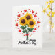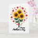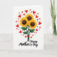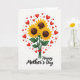 This greeting card features a digital illustration of three stylized sunflowers gathered like a thoughtful gift, with a gentle, affectionate mood ❤️. Each flower has a deep brown center surrounded by golden-yellow petals that feel sunny and welcoming. The green stems and wide leaves are bundled neatly, tied together with a small red ribbon that adds a romantic touch. Around the bouquet, many red hearts in slightly different sizes drift outward, like a warm hug spreading through the air. The plain white background keeps the focus on the yellow blooms, green foliage, and red accents without any distractions. Near the bottom, the words “Happy Mother’s Day” appear in smooth, flowing dark lettering, centered and easy to read. A few hearts float close to the text, and one sits near the lower right edge beside a small leaf 🌼.
