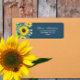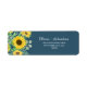 Design features a bouquet of watercolor yellow sunflowers, eucalyptus and others leaves and twigs on navy blue background.