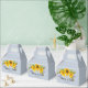 Pretty wedding favor box features watercolor sunflower bouquet on Plein Air (a pale blue) background with customizable text blocks in modern fonts