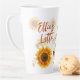 Sunflowers latte mug with customization. Tall white mug with sunflowers, lady bugs and dragonfly. Include a name, or name with "latte" in dark orange over a sunflower pattern background. This pretty summer floral design wraps around to cover all sides. This mug works great as a gift for the boss, country neighbor, teacher, or family member.
