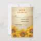 Rustic country wedding reply card with sunflower blossoms and burlap background texture.
