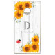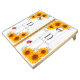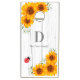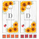 A rustic white wooden background, yellow and orange sunflowers and a cute red ladybug. Personalize and add your monogram letter and family name. Gray colored letters.