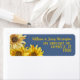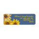 Wispy sunflowers return address labels. Three yellow flowers decorate the left-hand side of slate blue labels. The name and address is in two different fonts, with yellow script for the first line (name) and tall printed text for two or three lines of address..