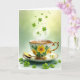 The front design shows a white porcelain teacup and scalloped saucer decorated with yellow sunflowers and deep green leaves, edged with thin gold rims and a curved gold handle. Inside the cup, amber tea glows with a light curl of steam, like a quiet invitation to linger with someone close 💚. A small gold spoon rests neatly on the saucer, angled as if it was just set down between two friends mid-conversation. Behind it all, the background fades from deep sage green to a lighter yellow-green, giving the scene a morning-lit glow. Bright green shamrocks float above the cup and drift across the foreground, their stems and shading making them look almost touchable ☘️. The overall palette mixes greens, golds, and sunny yellow in a gentle way that suggests an easy closeness, like shared tea and unspoken affection. There’s no printed wording, leaving open space around the cup while shamrocks hover in the air and scatter near the bottom edge, with the gold accents catching the light.