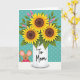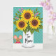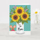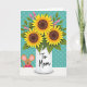 This design shows a digital illustration centered on a bouquet that feels like a caring gift offered with a shy smile ❤️. Three large sunflowers fill the upper area, with golden yellow petals and deep brown, detailed centers that draw your eye. They sit in a smooth white cylinder vase, and the words “To Mom” appear on the front in dark lettering, placed neatly in the middle of the vase. Green leaves spill outward around the blooms, and small bright pink flowers are tucked between the stems like little affectionate accents 🌼. In the lower left corner, a small rodent-like cartoon figure peeks up from behind a white ledge, as if watching to see Mom’s reaction. The character has round tan ears, tiny dot eyes, and a bashful look, wearing a pink top that echoes the pink blossoms. Behind everything is a teal-blue background dotted with lighter polka dots, while the white ledge cuts across the bottom edge.